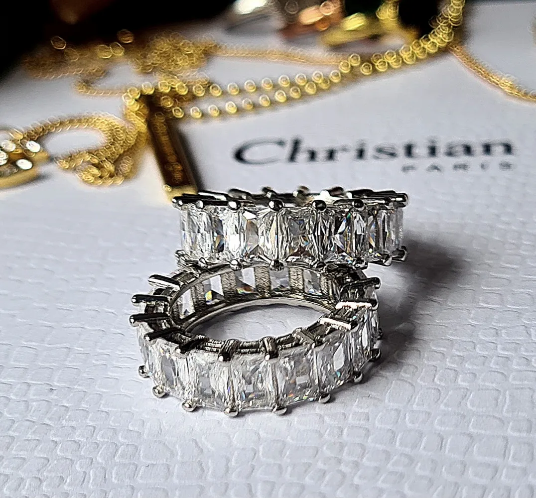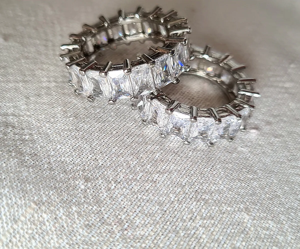Aliança de brilhantes, pedra formato Navetis, conhecida em semijoia, e cristal transparente, armação na cor prata.