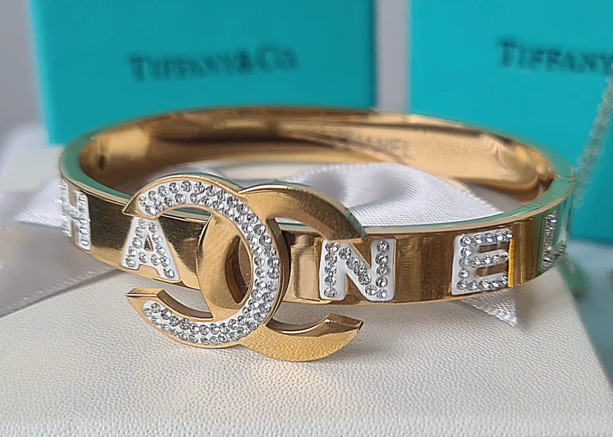 Bracelete confeccionado em semijoia, com logo grande no centro em alto relevo, zirconias, e nome da marca ao redor do bracelete, inspirado na coleção de Chanel.