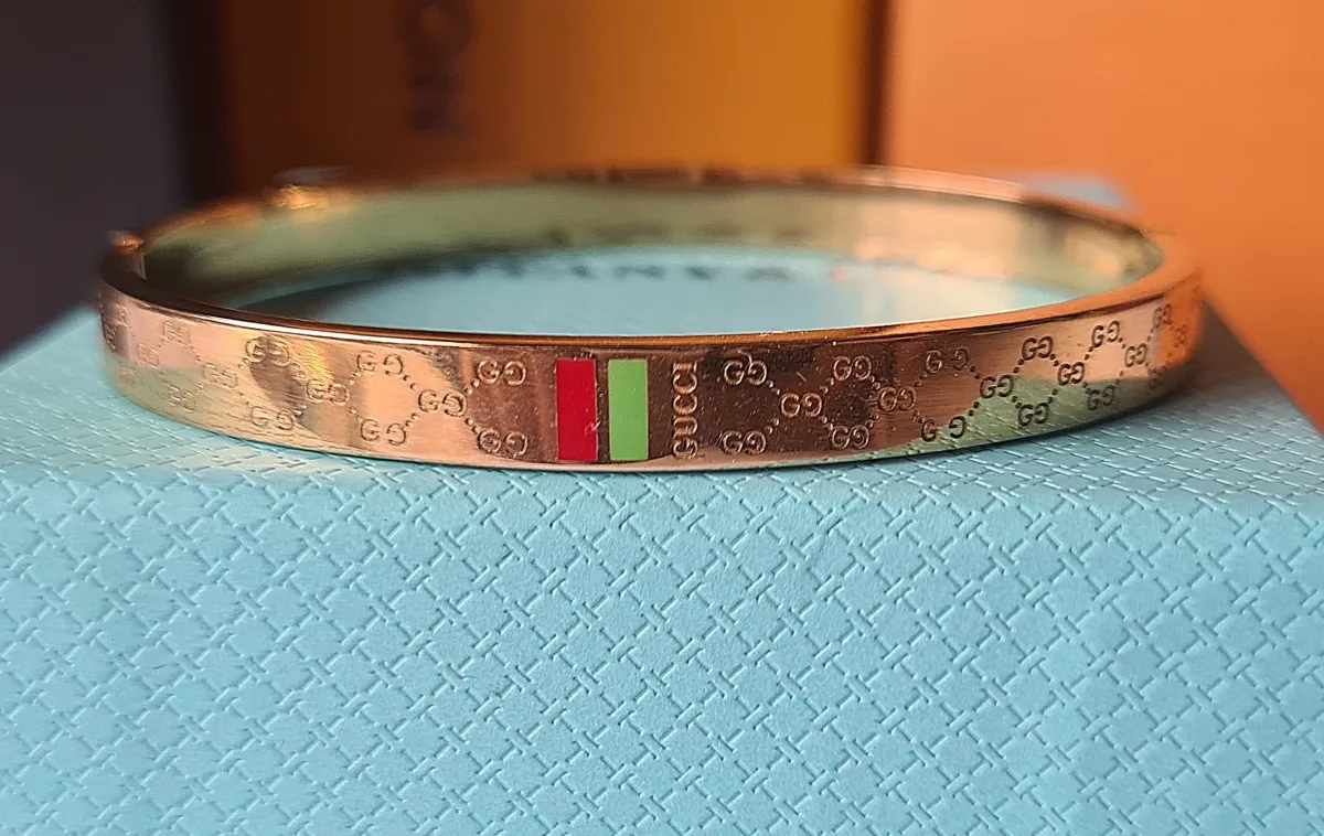 Bracelete confeccionado em semijoia importada, inspirado na coleção de Gucci, com logo ao redor do bracelete, e na frente do símbolo.