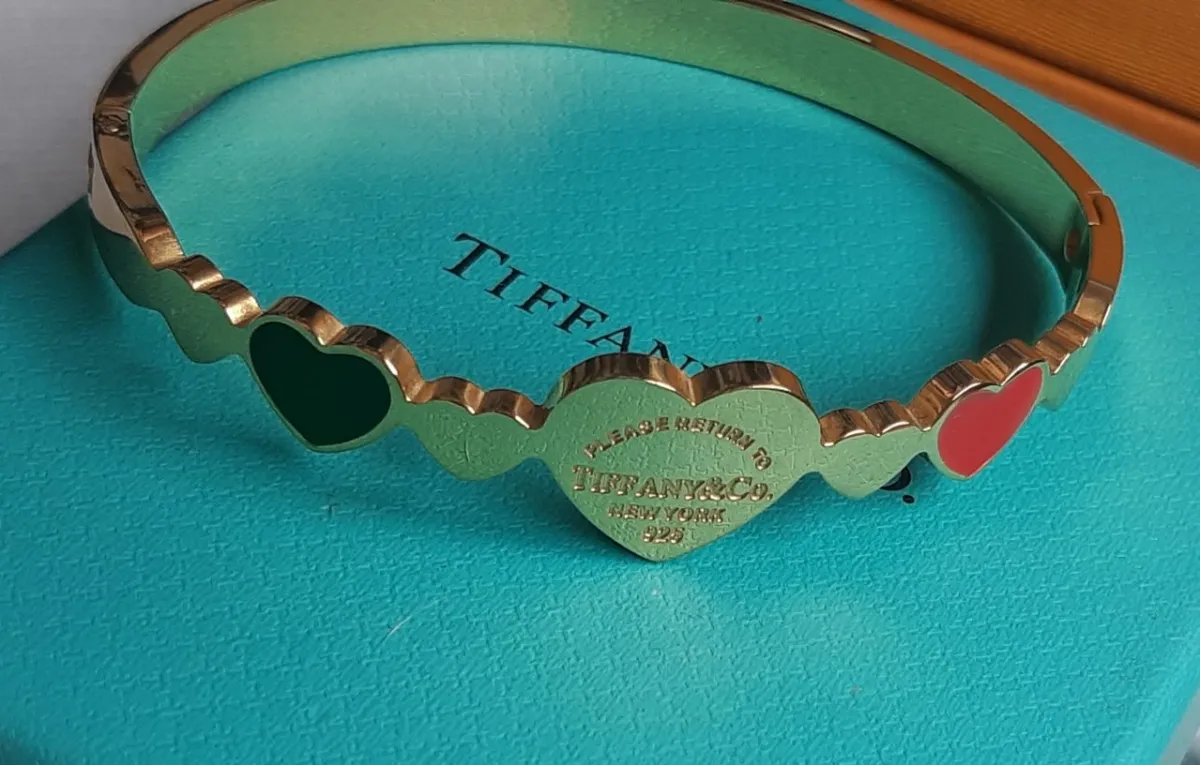 Pulseira Tiffany&Co rígida corações vermelho e verde.